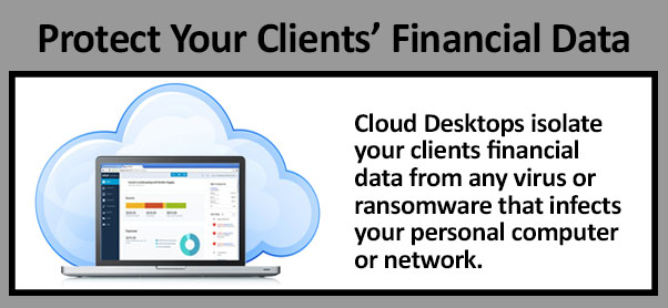 Most significantly, by using a Cloud desktop service to host QuickBooks and/or Sage, bookkeepers isolate their clients’ business-critical financial data from any virus or ransomware that infects their personal computer or any other computer on their local network. This isolation coupled with being hosted on a private server provides powerful protection from ransomware.