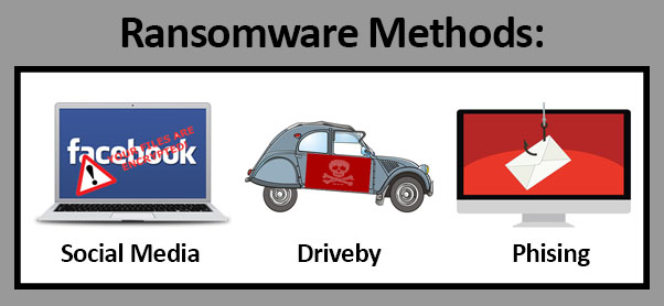 Common methods of ransomware infestation are email phishing, drive by downloading, and social media files. With email phishing the ransomware is part of attachment or link in the email. As attacking methods become more sophisticated these emails look more and more legitimate.